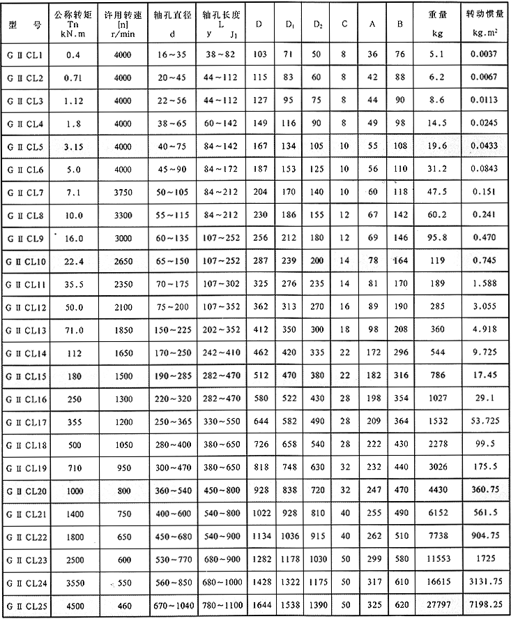 GⅡCL型 聯軸器參數與尺寸(mm)