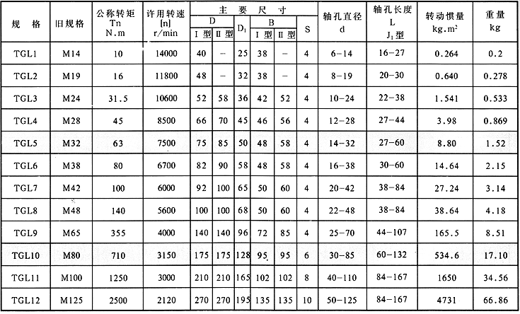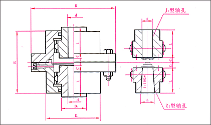 CL型齒式聯軸器,適用于聯接兩水平同軸線傳動軸系。具有一定的補償兩軸相對偏移的性能,傳遞公稱扭矩為0.71~1000KN·m。 CL型 聯軸器參數與尺寸(mm 注: 1、聯軸器重量和轉動慣量是按軸孔最小直徑和最大長度計算的近似值。 2、錐孔直徑d≤140mm。 3、J1型軸孔根據需要,亦可不使用軸端擋板。